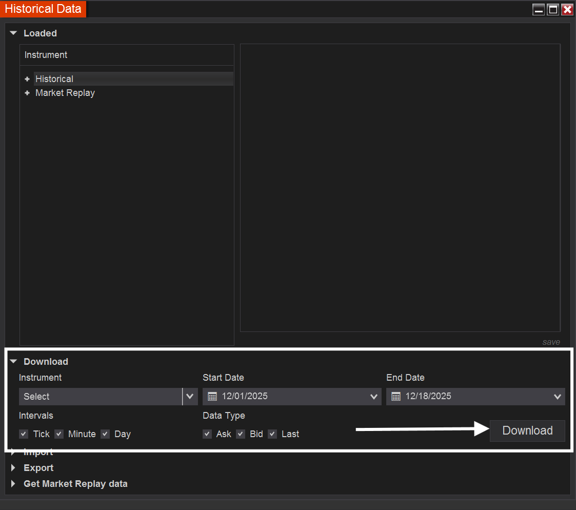 Step 2: Choose the instrument you want to add data for, the time range, intervals and data type.